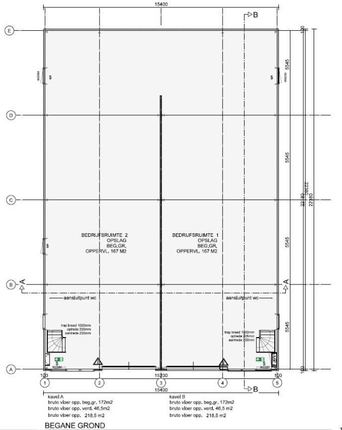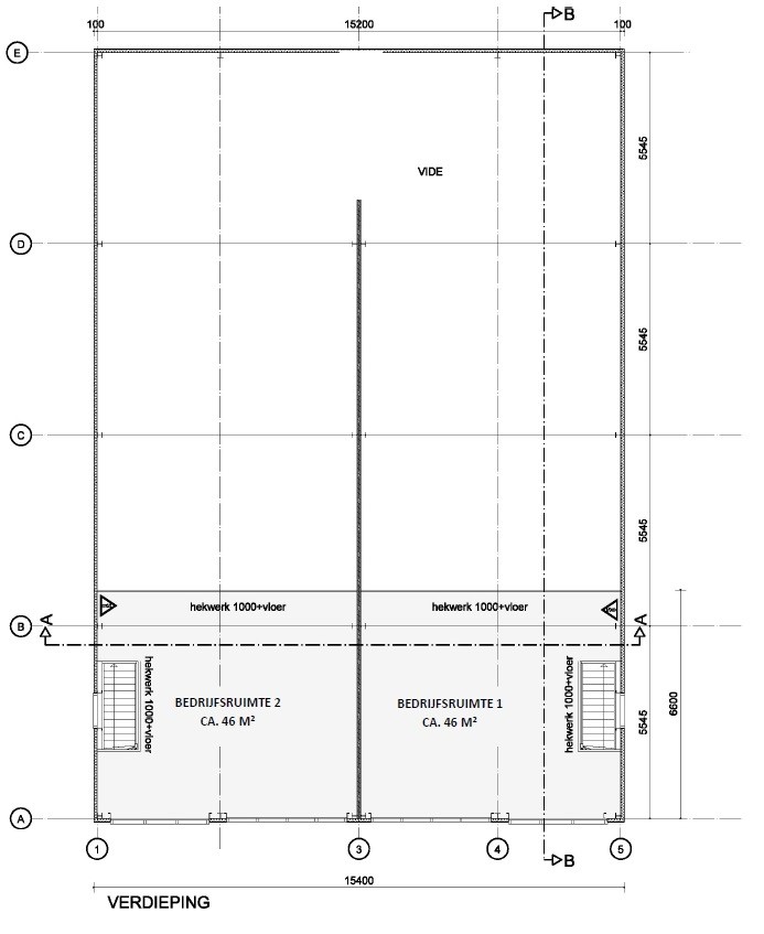 Op de begane grond is er een ruime hal van ca. 15 meter breed en ca. 22 meter diep en ca. 6,5 meter hoog. Dat is 330 m² aan vloeroppervlak! Een ideale hal voor bijvoorbeeld een werkplaats, opslag of showroom. Er zijn 2 overheaddeuren, een loopdeur en 2 trappen naar de 1e etage. De hoge glazen pui aan de voorzijde zorgt dat hier veel licht naar binnen komt. Onder de verdiepingsvloer is het plafond 3.7 m hoog.
