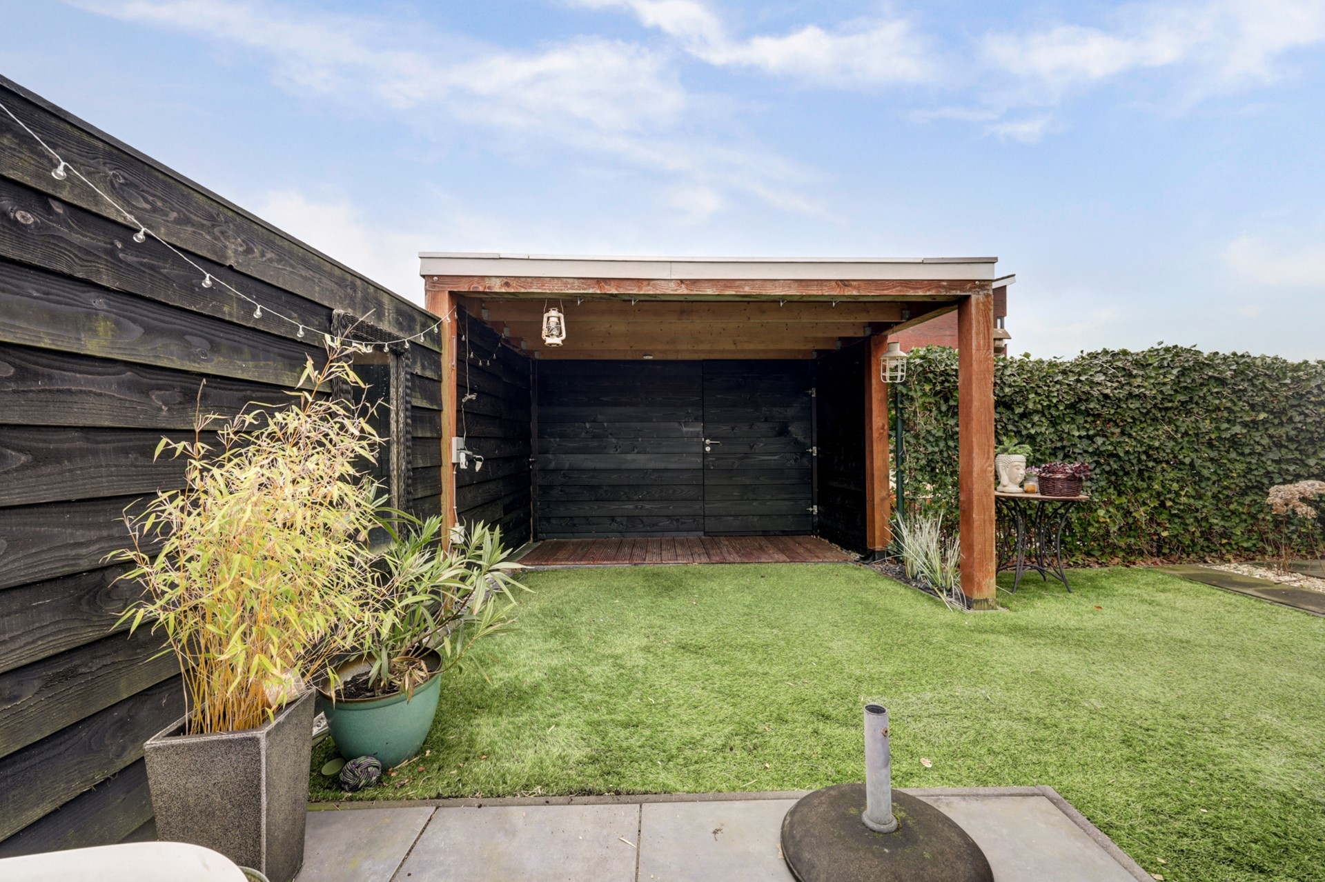 Omdat dit huis op een hoek is gelegen beschik je over een extra grote tuin. De ligging van de tuin is voornamelijk op het zuiden. Je bent hier dus verzekerd van een gunstige zonligging. Veel werk heb je aan deze tuin overigens niet, want deze is grotendeels betegeld met grote antracietkleurige tegels en voorzien van kunstgras. Zo houd je meer tijd over om te kunnen genieten van je nieuwe stek vlakbij het water. Een mooi pluspunt is grote overkapping achter in de tuin met daaraan vast een riante berging.